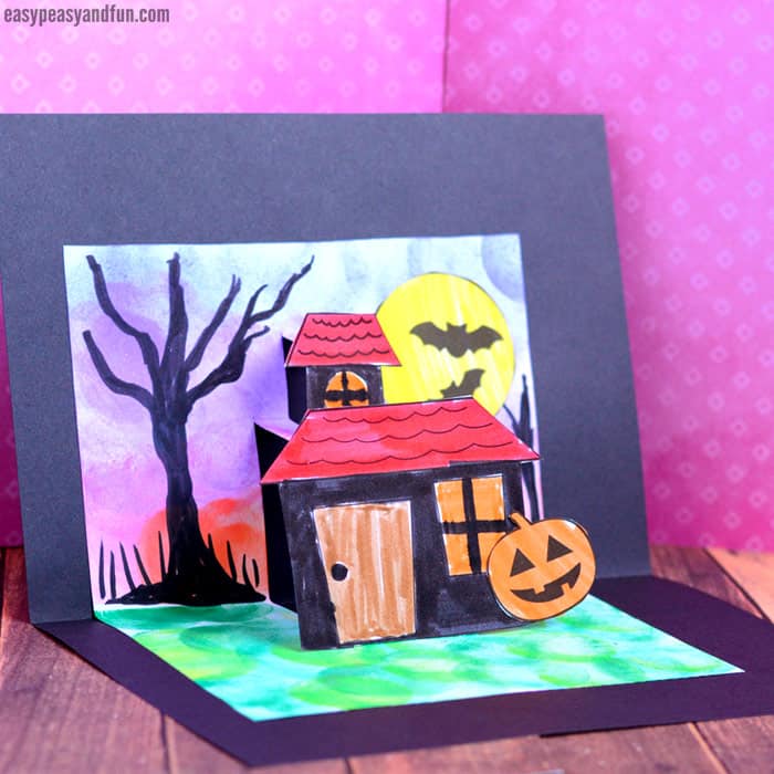 来自easypeasyandfun的DIY万圣节立体贺卡,非常简单的90度景层结构,带有各种万圣节元素,需要涂色后粘贴